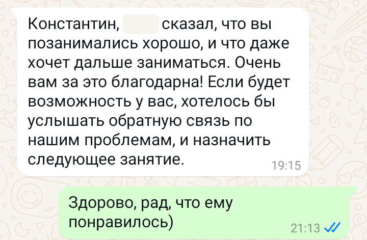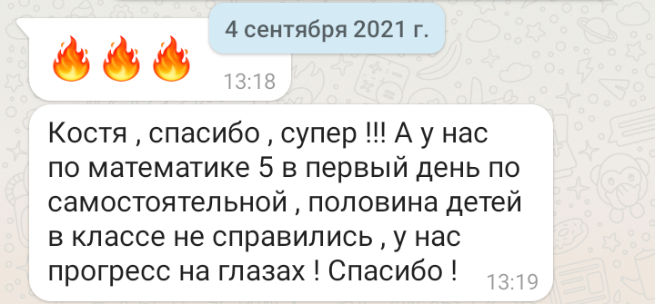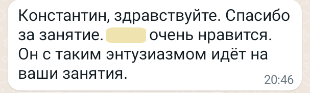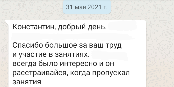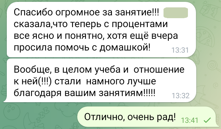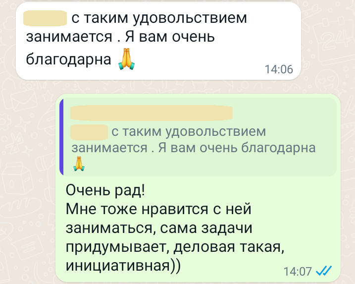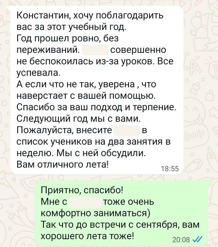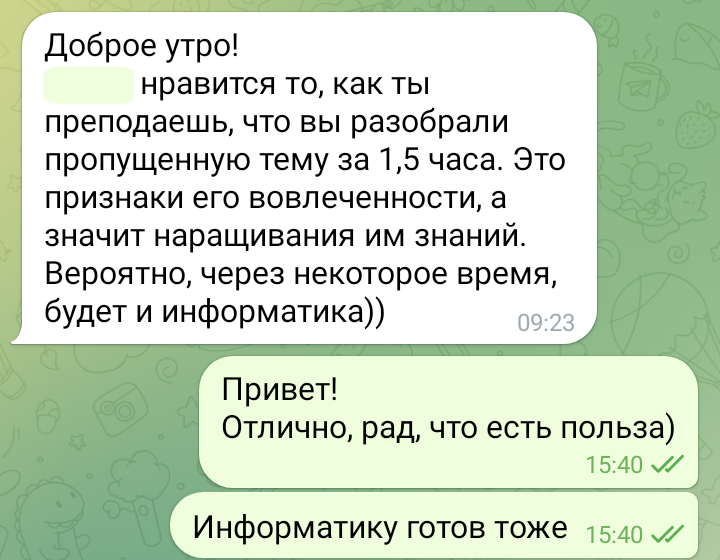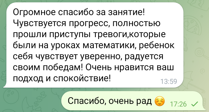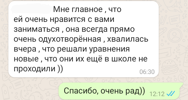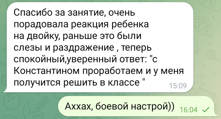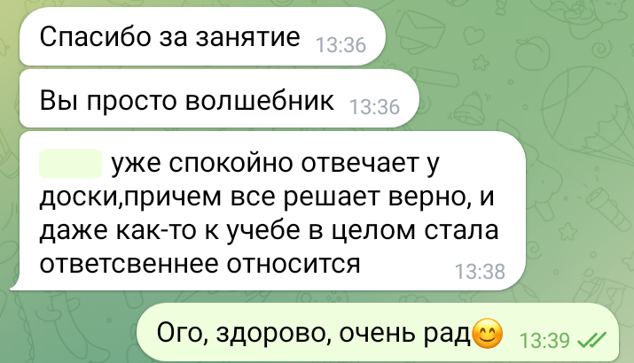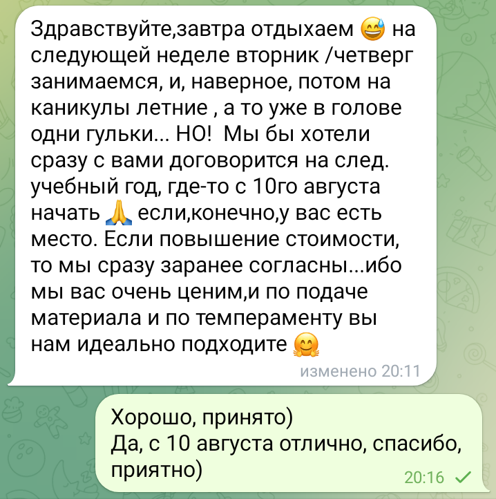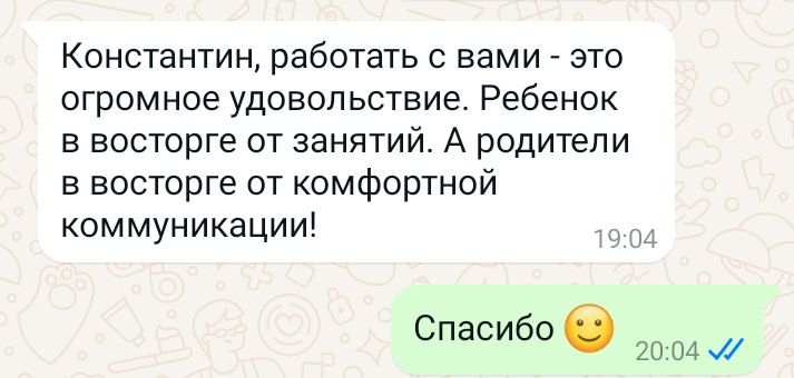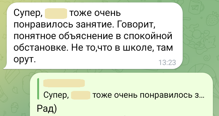 Помогаю ученикам во внеурочное время и поощряю их к самостоятельным занятиям. Не гарантирую, что отвечу сразу, но, как только могу, пишу сообщение или записываю голосовое.