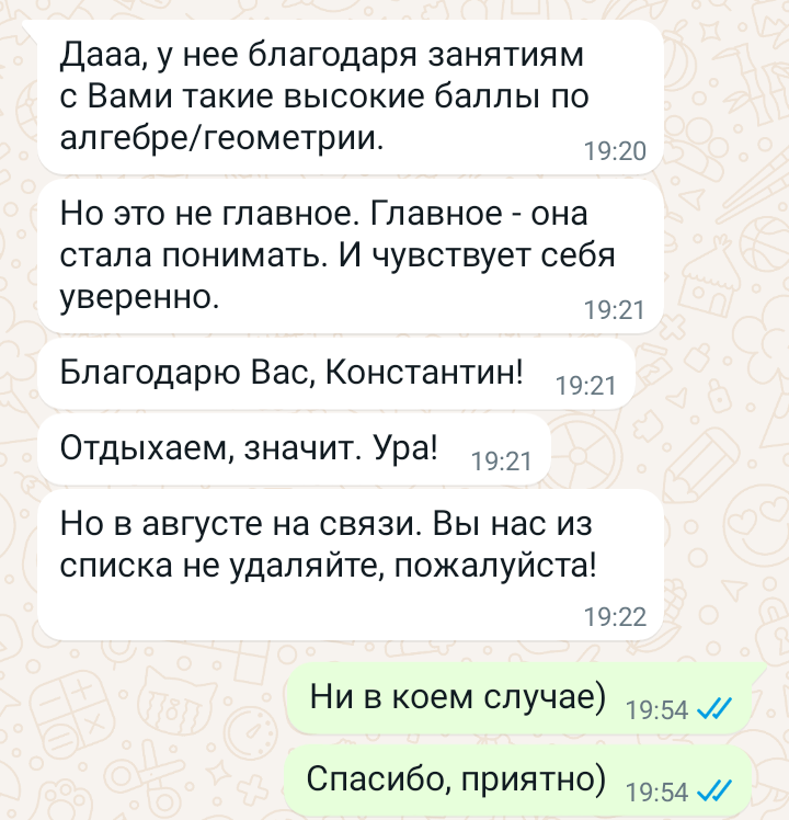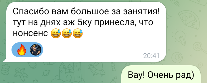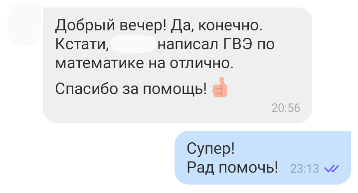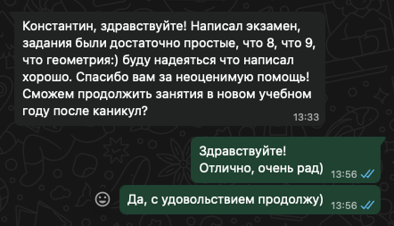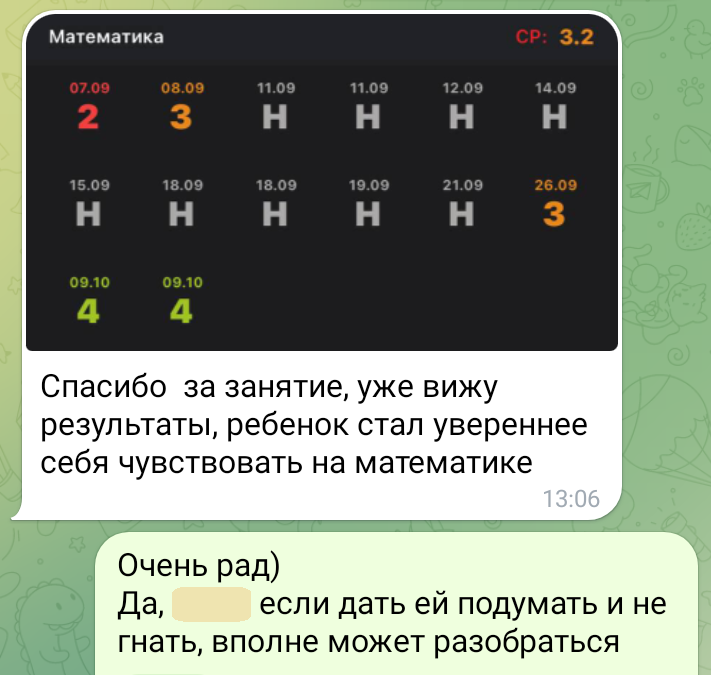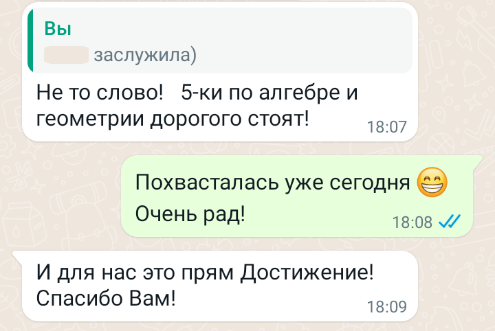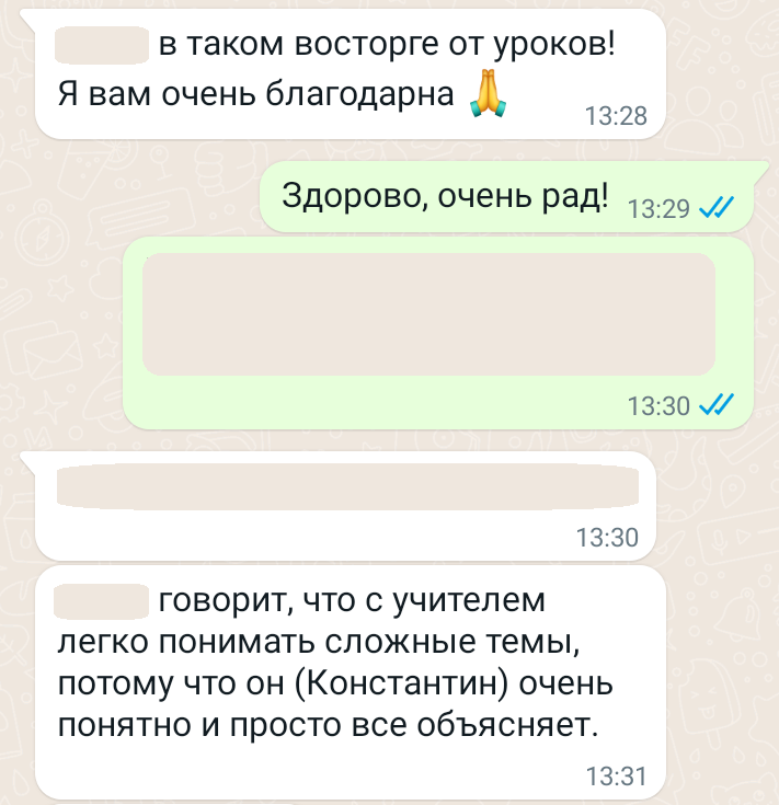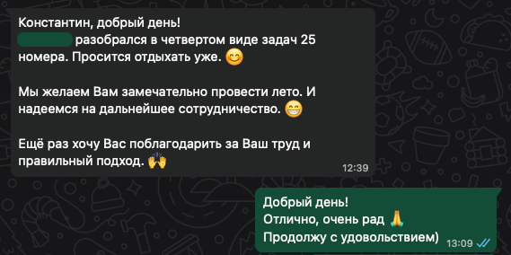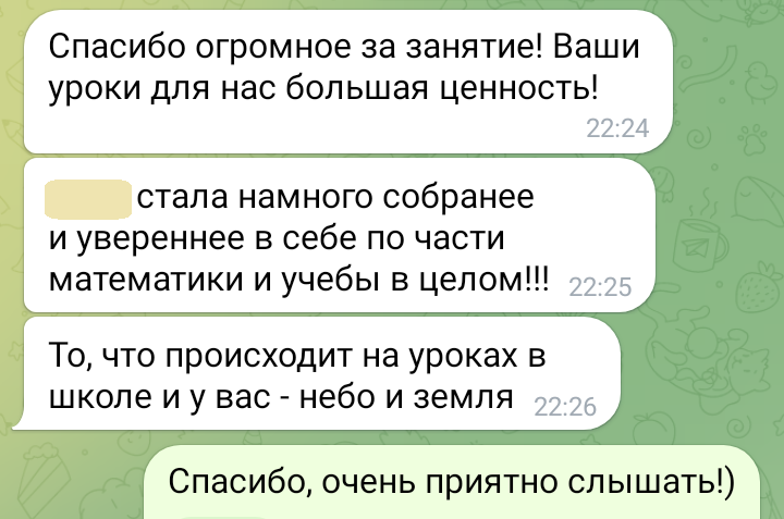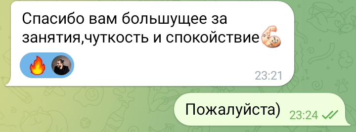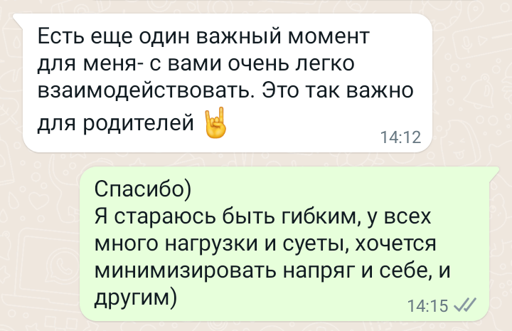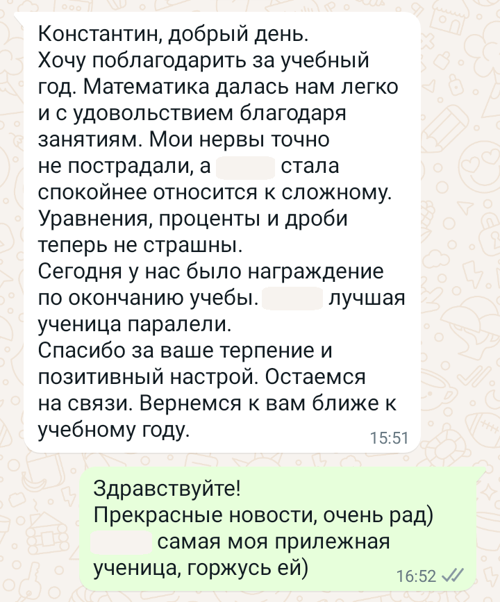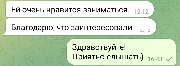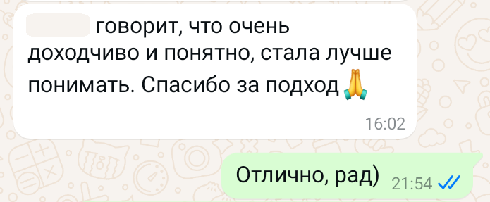 Помогаю ученикам во внеурочное время и поощряю их к самостоятельным занятиям. Не гарантирую, что отвечу сразу, но, как только могу, пишу сообщение или записываю голосовое.