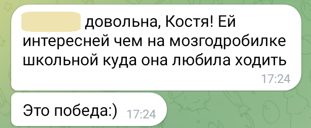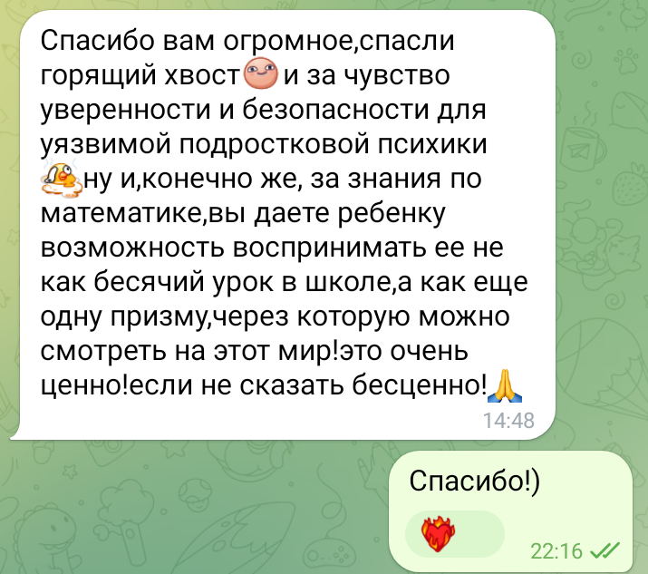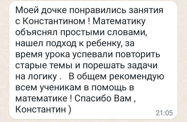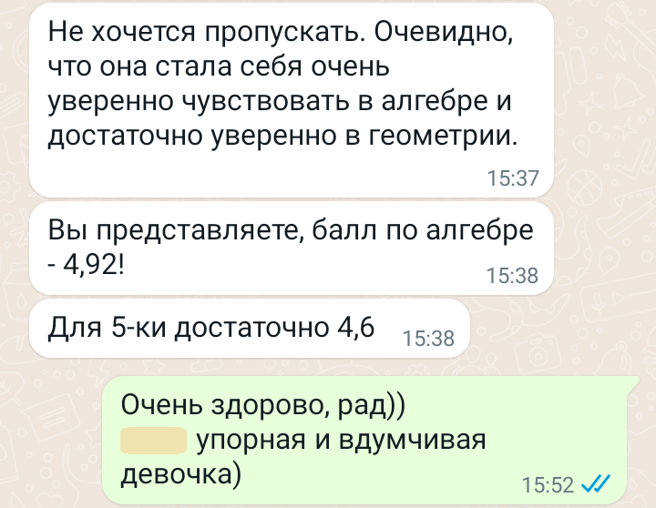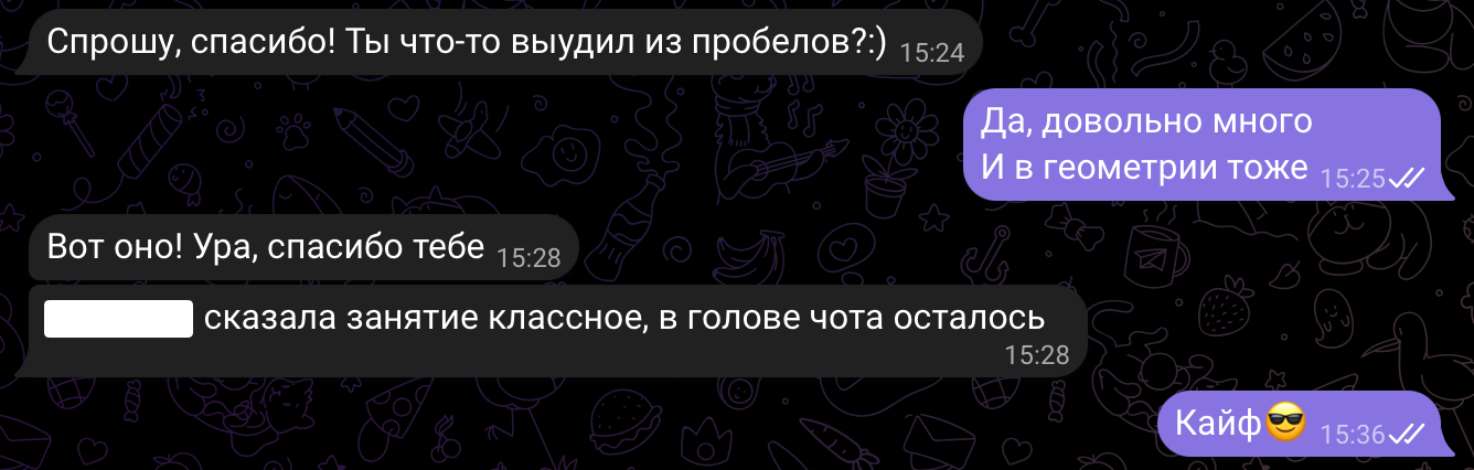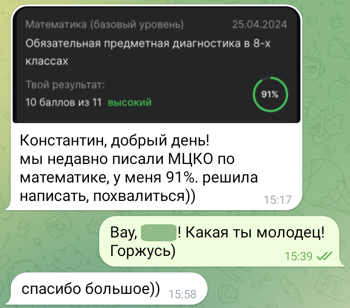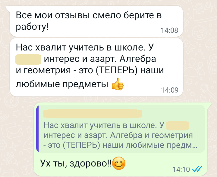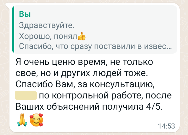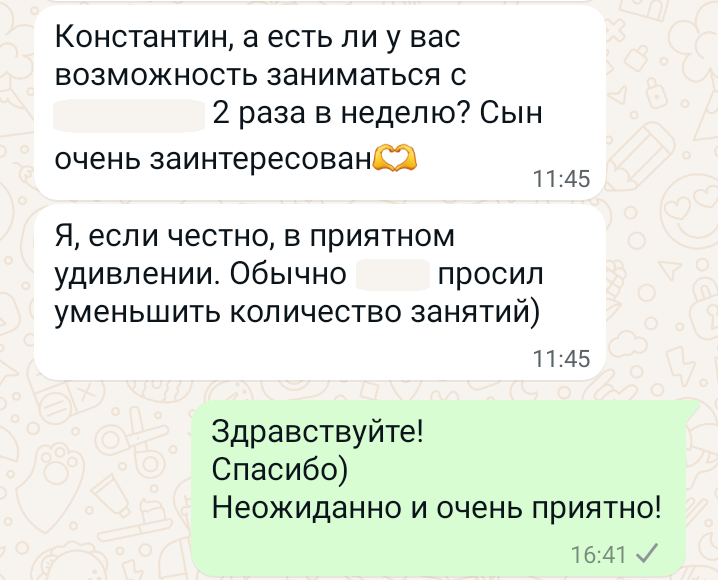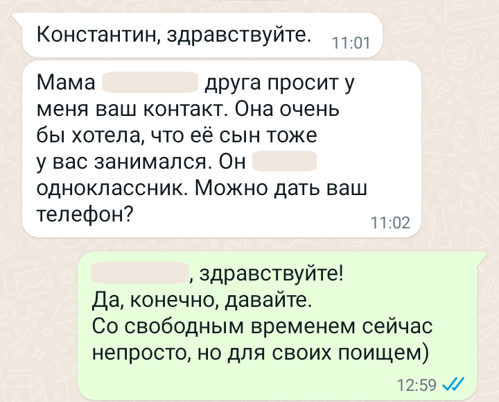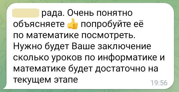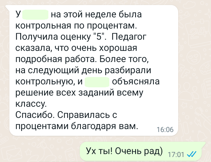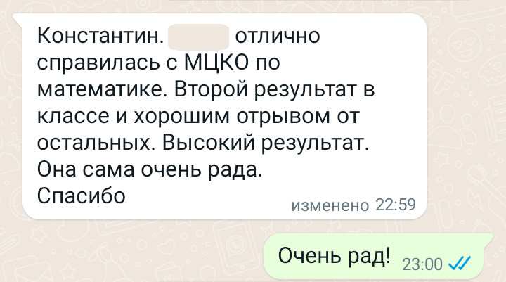 Помогаю ученикам во внеурочное время и поощряю их к самостоятельным занятиям. Не гарантирую, что отвечу сразу, но, как только могу, пишу сообщение или записываю голосовое.