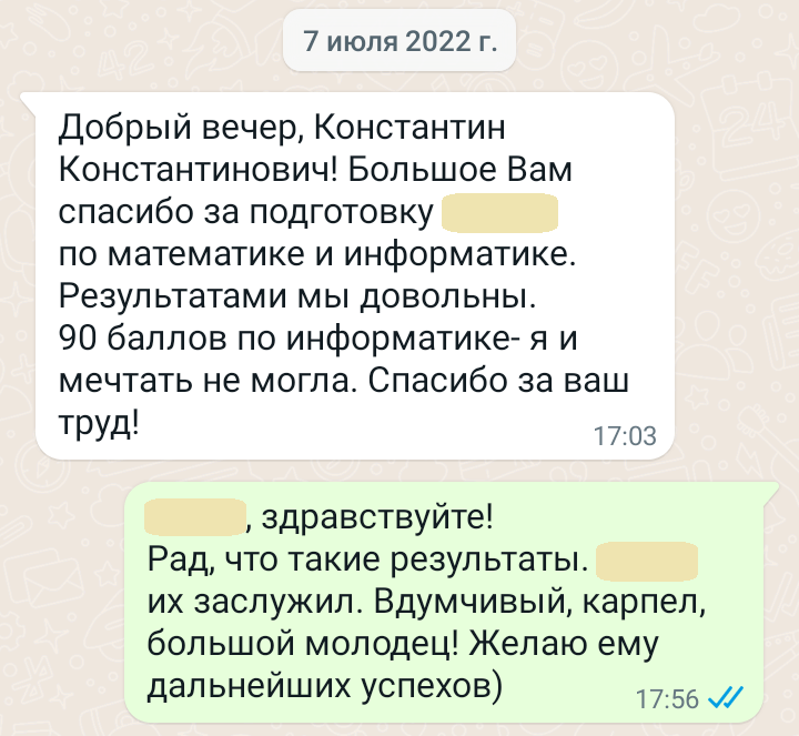 Максимальные баллы ЕГЭ среди моих учеников — 90 по информатике, 84 по математике.