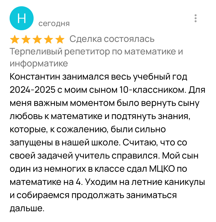 Спокойный и терпеливый, не давлю, не ругаюсь за ошибки, помогаю ребятам раскрыться и перестать бояться информатики и математики.